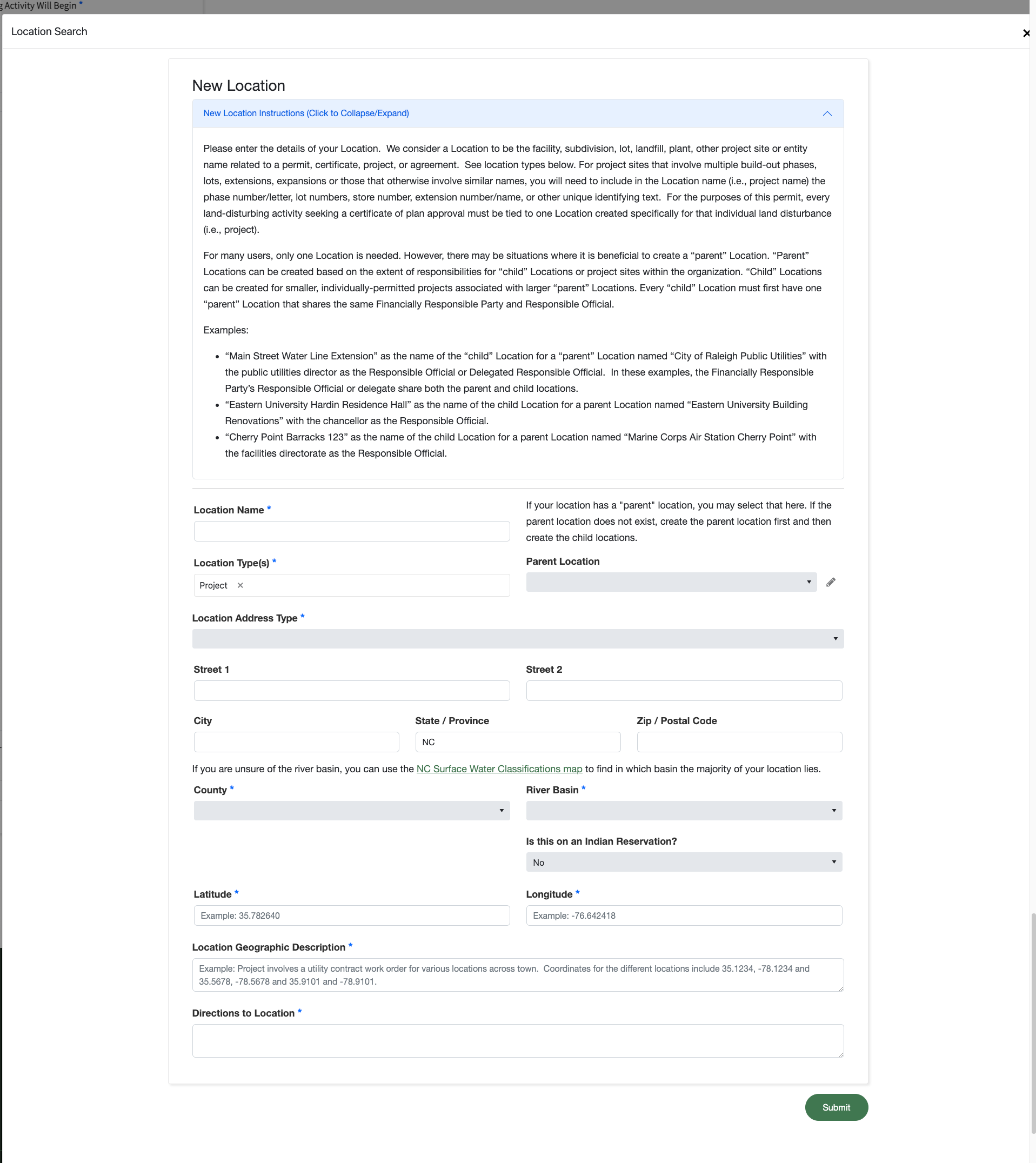 • Each program may use a slightly different "Add Location" detail screen.  For example, the Erosion & Sediment Control" permit application uses a much more detailed location description because often there is no street address.