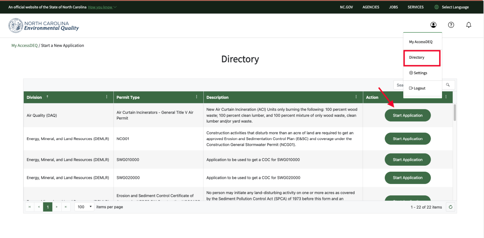 • Click on the Directory menu (under the person icon), and then on a big green “Start Application” button to the right of the permit type you are interested in