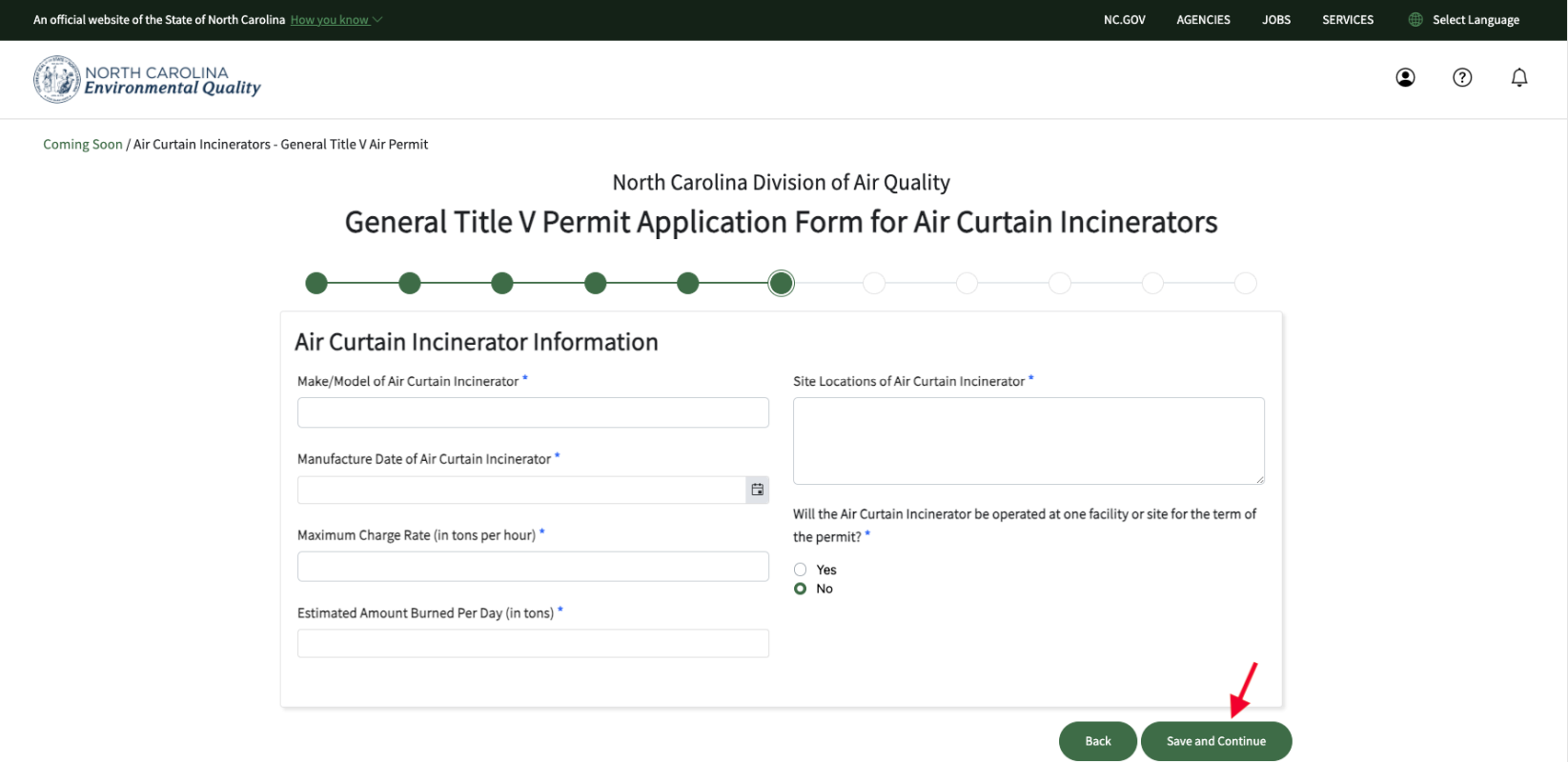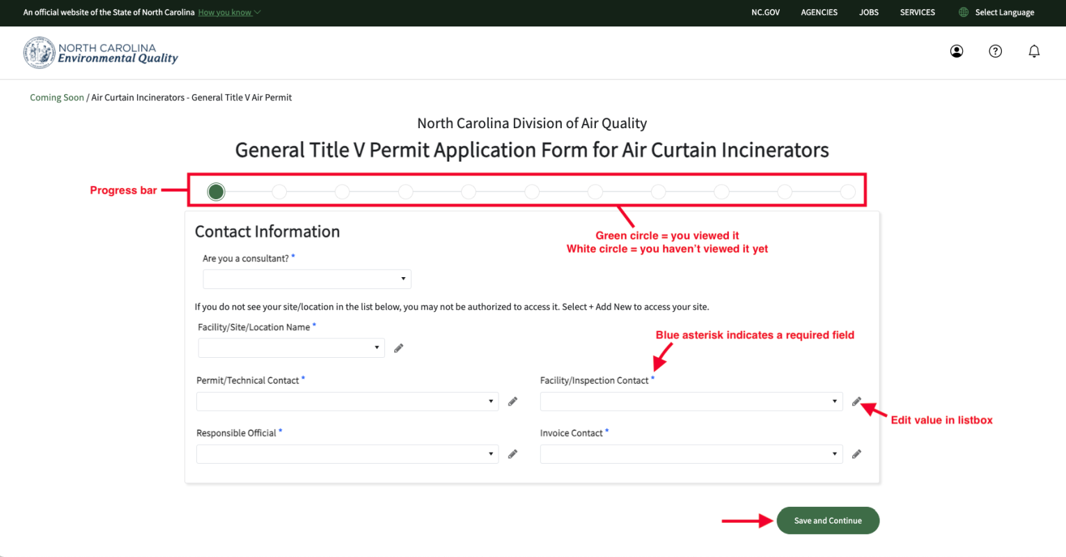 • As you progress within the permit application screens, you will see a series of white dots across the top of your screen, from left to right.  These white dots change to filled-in green dots as you visit each page of the permit application.  On the bottom right of each screen, you will see two large green buttons: "Previous" and “Save and Continue”.  Keep moving from screen to screen by clicking on the “Save and Continue” buttons.  Note that you will need to enter required fields before you can proceed to the next screen.