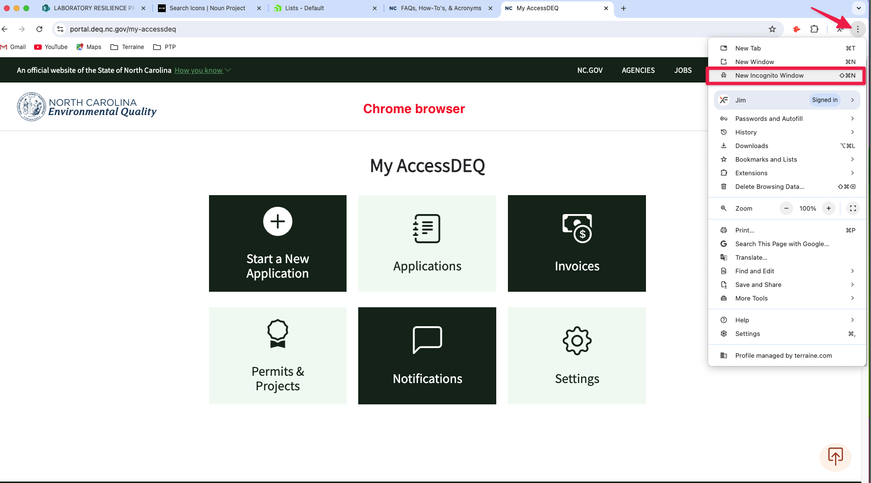 In Incognito, none of your browsing history, cookies and site data, or information entered in forms are saved on your device. This means your activity doesn't show up in your Chrome browser history, so people who also use your device won't see your activity. And in terms of cached files, nothing cached by your browser is used when serving up a website page in incognito mode. That means that instead of using cached files to serve up a website page, the browser will visit the website and request fresh content from that website page, thus avoiding anything old and/or corrupted. This often will resolve issues you might be experiencing with DEQ's external portal.